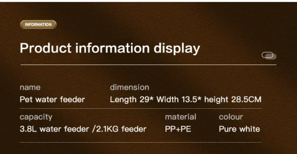 Color | 1.3Kg and 3.3L, 2.1Kg Food, 3.3L Water, 1.3Kg Food, 2.1Kg and 3.8L, 3.8L Water |